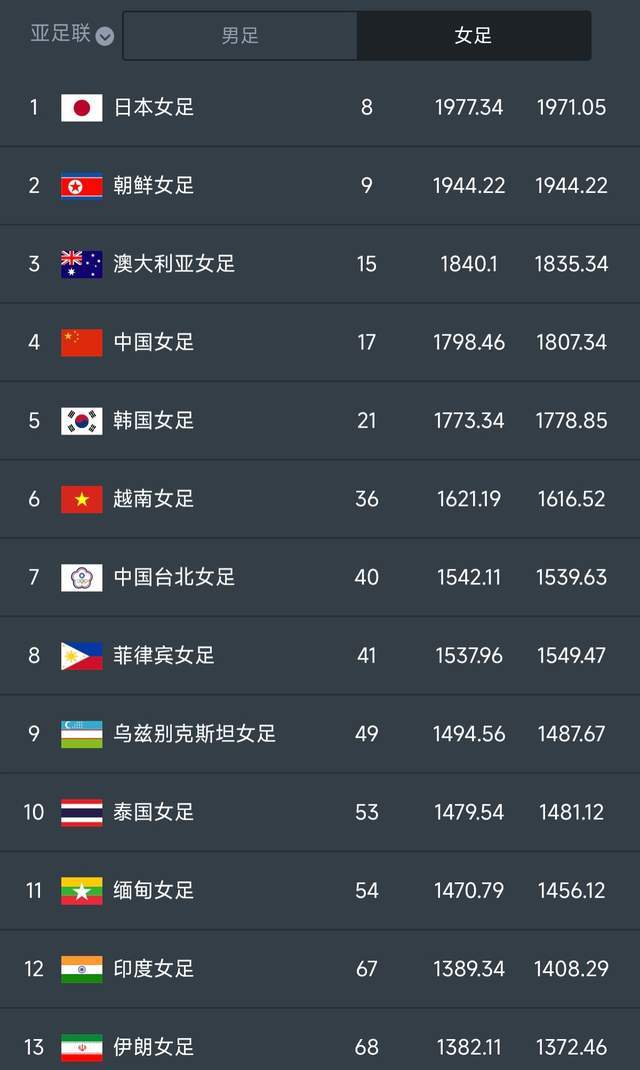 3,打开亚洲足球的实力排行榜,伊朗男足的排名非常不错,位居亚洲第2,世界第20位,他们已经7次杀进世界杯正赛。但是伊朗女足的亚洲排名则是第13位,世界排名只有第68名,而且,她们首次参加亚洲杯,还是在2022年的印度。这一次的澳大利亚亚洲杯,是她们第二次公开亮相。